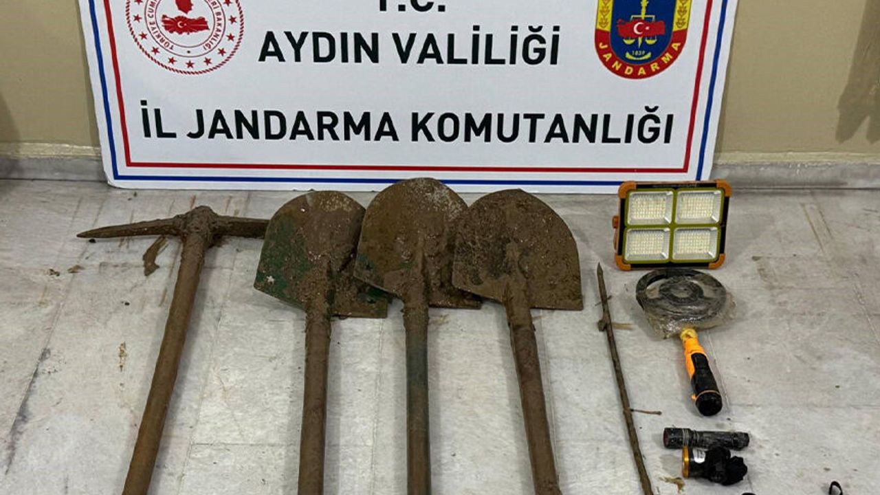 Aydın İl Jandarma Komutanlığı ve Efeler İlçe Jandarma Komutanlığınca yürütülen çalışmalar kapsamında, Kalfaköy Mahallesi’nde kaçak kazı yapıldığı tespit edildi. Bölgede gerçekleştirilen çalışma neticesinde V.A. (30), M.S. (56), M.Ş. (28), S.Y. (58) ve M.Y. (43) isimli şüpheliler kaçak kazı yaparken suçüstü yakalandı. Şüphelilerle birlikte 1 adet el dedektörü, 1 adet kazma, 3 adet kürek, 1 adet güneş paneli ve 3 adet el feneri ele geçirildi.