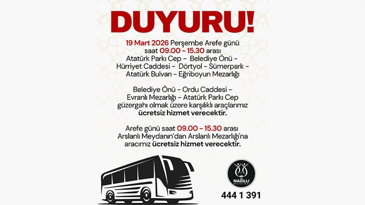 Belediyeden yapılan açıklamaya göre, arefe günü saat 09.00 ile 15.30 arasında belirlenen güzergahlarda ücretsiz servis araçları hizmet verecek. Servisler; Atatürk Parkı, Belediye Hizmet Binası önü, Hürriyet Caddesi, Dörtyol, Sümerpark ve Atatürk Bulvarı güzergahını takip ederek Eğriboyun Mezarlığı ve Evranlı Mezarlığı’na ulaşım sağlayacak.